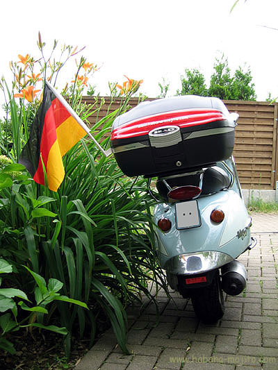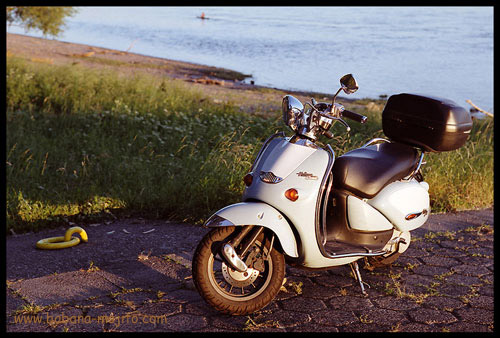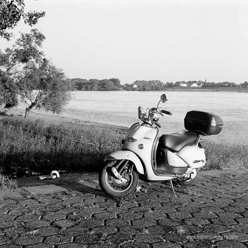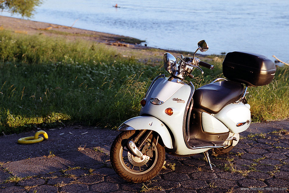 Am Rhein bei Leverkusen-Hitdorf Bj. 2001, In Verkehr gebracht 02.2002. Deshalb leider nur 45 Km/h max. Sturzbügel von Hepco & Becker. Koffer Shad SH 44. Original Kofferträger. Auspuff "Leovince Touring".