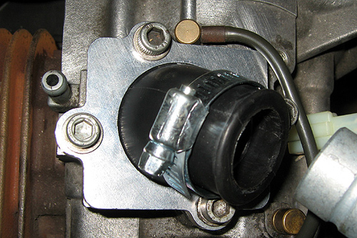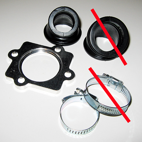 Hier seht Ihr den neuen Ansaugstutzen und mit welchen Teilen Ihr ihn kaufen könnt. Die beiden durchgestrichenen Teile sind für größere Vergaser. Die Platte muss natürlich anders herum montiert werden um abdichten zu können. Den Schnorchel könnt Ihr nach Wunsch passend drehen, anschließend beim festziehen auf die dünnen Schläuche der Ölversorgung achten ! |