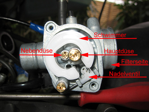 | Hier die Ansicht des Vergasers von unten ohne Gehäuse falls Ihr eine andere Düse einbauen wollt. |