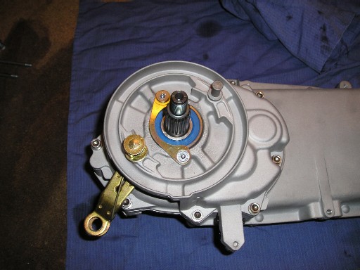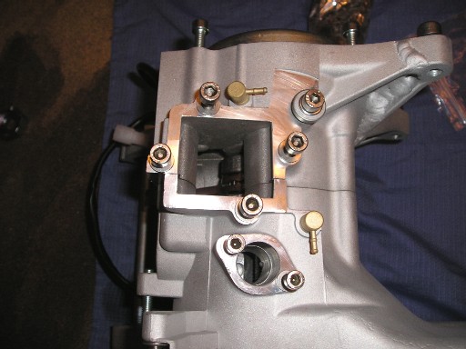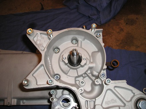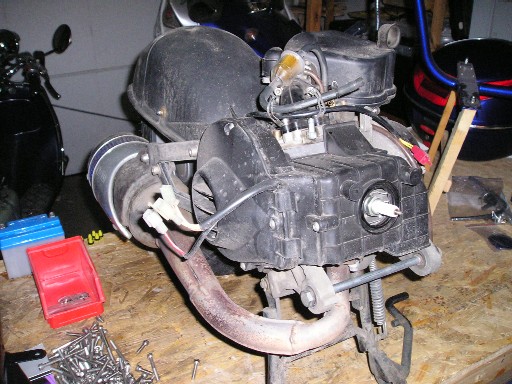 | ...auf welches dann quasi das Anlasserritzel gebaut wird, dass beim Starten ein großes Riltzel antreibt, dass direkt unter der Variomatik auf der Kurbelwelle sitzt (aber im Moment nicht sieht). | So, jetzt kommen wir zum Vergaser- & Ansaugtrakt... |