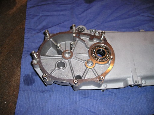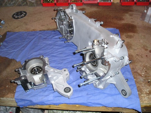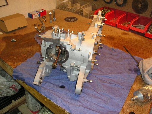 | So sieht also das Gehäuse des Motors aus, nachdem ich alles sandgestrahlt hatte und alle Lager eingepresst worden sind... | Jetzt ist die Kurbelwelle eingepresst und die beiden Gehäusehälften wieder zusammengebaut. |