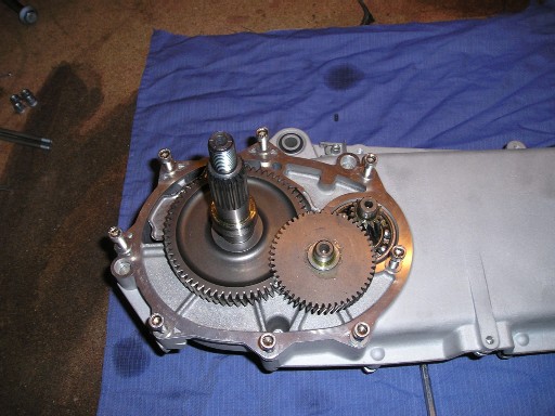 | Auch hier galt es, alle Teile sauber zu bekommen und neue Lager und neue Dichtungsringe (Simmerringe) einzubauen ! | Das Getriebe in offener Form : 3 Zahnräder stellen das gesamte Hinterachsgetriebe dar... |