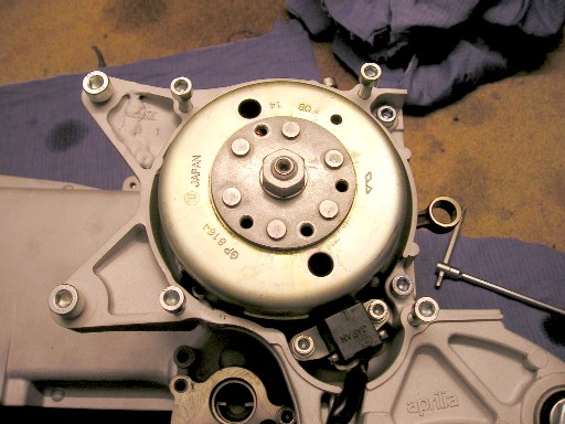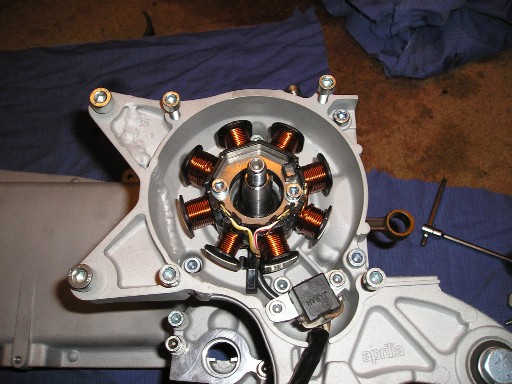 | Wenden wir uns nun der Anbauten an der Kurbelwelle zu : Auf der rechten Seite der Kurbelwelle befindet sich die Lichtmaschine und die Zündung. | Hier sieht man ganz deutlich die Lichtmaschine mit ihren Spulen und unten den kleinen schwarzen Kasten (Pickup), der den Zündimpuls abnimmt, um ihn an die CDI weiterzuleiten. |