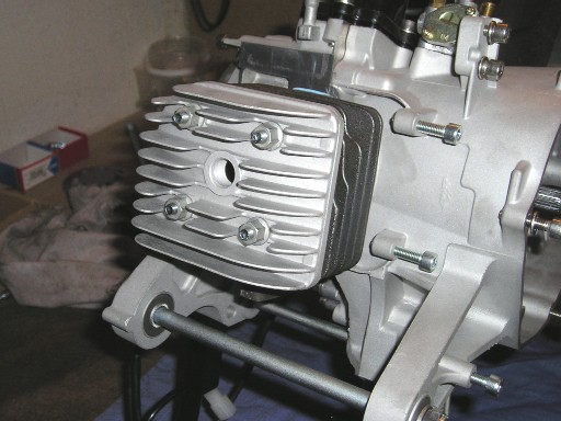 | Dann kann man noch das Hinterrad einbauen und schon kann man das Ganze schön hinstellen. | Danach hab ich den Zylinder eingebaut und mit einem Drehmomentschlüssel angezogen (Wichtig !). |