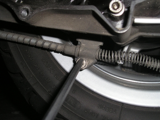 | Dann würd ich die Schlossabdeckung auf der hinteren linken Seite demontieren, dann kommt ihr später besser an den Stossdämpfer ran. | Da ihr schon auf der linken Seite seid, kommt die Hinterradbremse dran, hier speziell die Rändelmuter zum Einstellen ganz rausdrehen. |