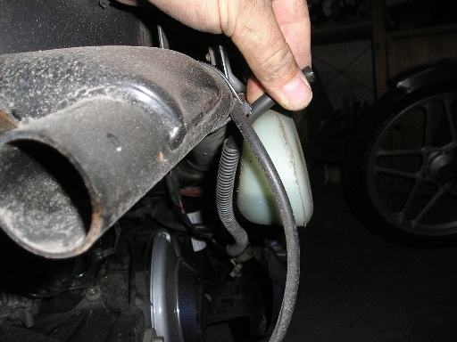 | Weiter geht's... So, um es hier zu zeigen, sollte die Oelversorgung abgeklemmt werden. Ich würd erstmal die beiden Klammern, die um den Schlauch gewickelt sind aufbiegen, damit ihr den Schlauch nach dem Abziehen gleich nach rechts oben beim Oeltank einklemmen könnt, so läuft nämlich kein Oel aus der Leitung. |