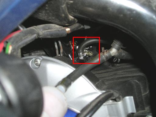 Seite einen Schlauch erkennen, der nach vorne weggeht. Hierbei handelt es sich um den Unterdruckschlauch, der zur Benzinpumpe führt, der muss auch weg. Passt aber auf den Nippel auf, der tendiert dazu, locker zu werden. Wenn es das tut, klebt ihn unbedingt wieder ein, der er kann die Benzinzufuhr durch Falschluft lahmlegen. |