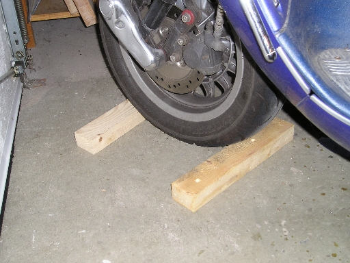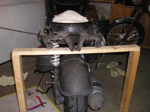 somit mal erledigt. Ich hab mir mal vor Urzeiten ein kleines Gestell gebaut, auf das ich den Rahmen des Rollers locker aufsetzen kann, sonst würde der Roller ja unweigerlich umkippen. Also vorne erst das Vorderrad verkeilt und dann den Rahmen auf das Gestell gestellt. |