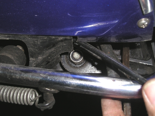 | So, jetzt hängt das Ganze nur noch an einer Schraube ! | Die Mutter runterschrauben (SW 17) und die Achse einfach auf der rechten Seite rausziehen. |
