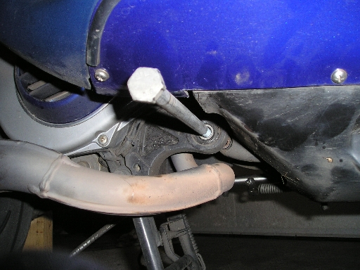 | Wenn ihr nix vergessen habt, könnt ihr den Motor komplett hinten rausziehen. Er selber steht ja auf dem Hauptständer, während der Rest des Rollers gut auf dem Vorderrad und dem gebauten Ständer steht. | |