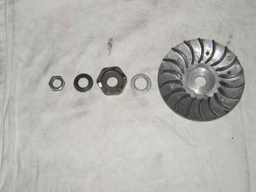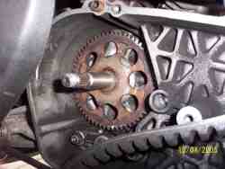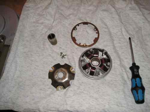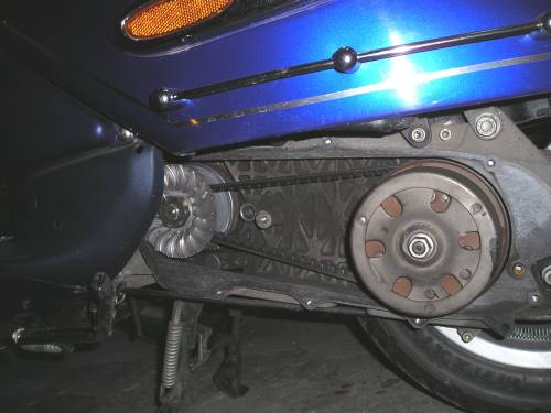 empfindlichste Teil des gesamten Antriebes. Sie beinhaltet Rollen, die man gewichtsmäßig ändern kann, um die Übersetzung zwischen dem Anfahren und der Endübersetzung (ab ca. 50 - 60 km/h) zu bestimmen. Je länger eine Übersetzung wird (mit schwereren Rollen), umso niedriger werden die Drehzahlen im mittleren Fahrbereich, aber genauso nimmt auch die Durchzugskraft ab. Je kürzer die Übersetzung mit leichteren Rollen bewirkt wird, umso besser wird zwar der Durchzug, aber genauso steigen parallel dazu die Drehzahlen und auch leider der Verschleiß. Jetzt könnt ihr euch vielleicht ein klein wenig vorstellen, wie diffizil eine optimale Abstimmung der Rollen zum Wandler sein kann. |