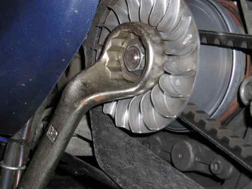 Das Mitnehmerritzel des Kickstarters, welches auf der Vario sitzt, müsst ihr mit einem gekröpften 32-er Ringschlüssel festhalten ! |