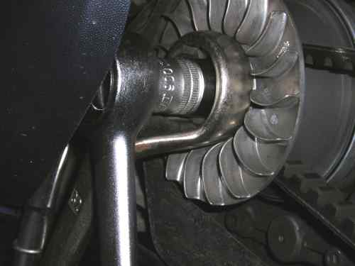 Die kleine Mutter in der Mitte (M12x1,25) könnt ihr dann mit einer Ratsche und einer 17-er Nuss abschrauben. |